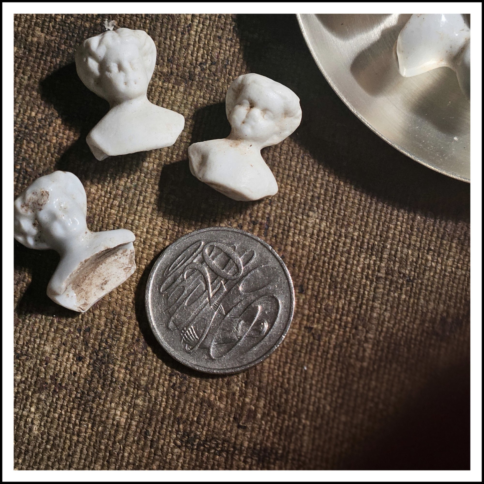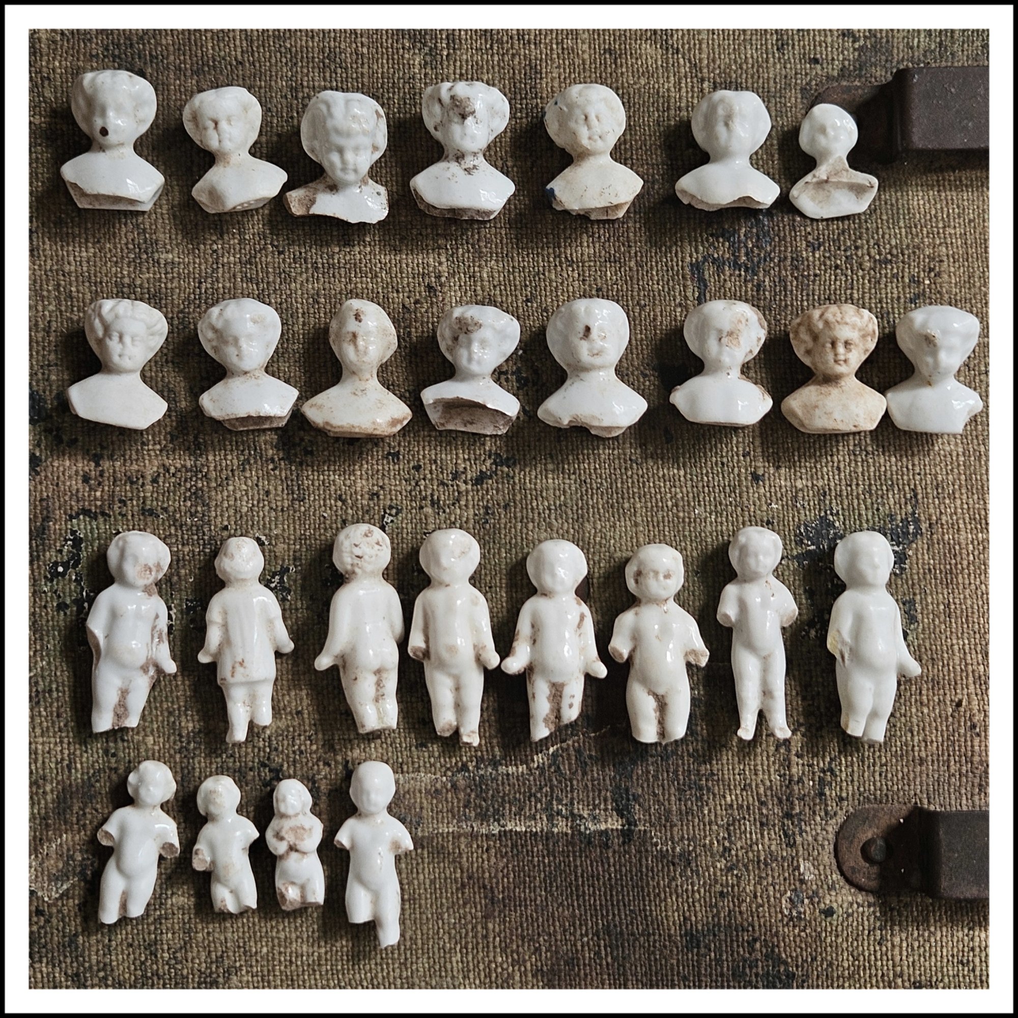 Delightful remains from an 1880's German doll factory, these pieces were glazed & painted by farmers wives and the rejects tossed out into the yard's manure pile which the farmer would then distribute over his garden in Spring.