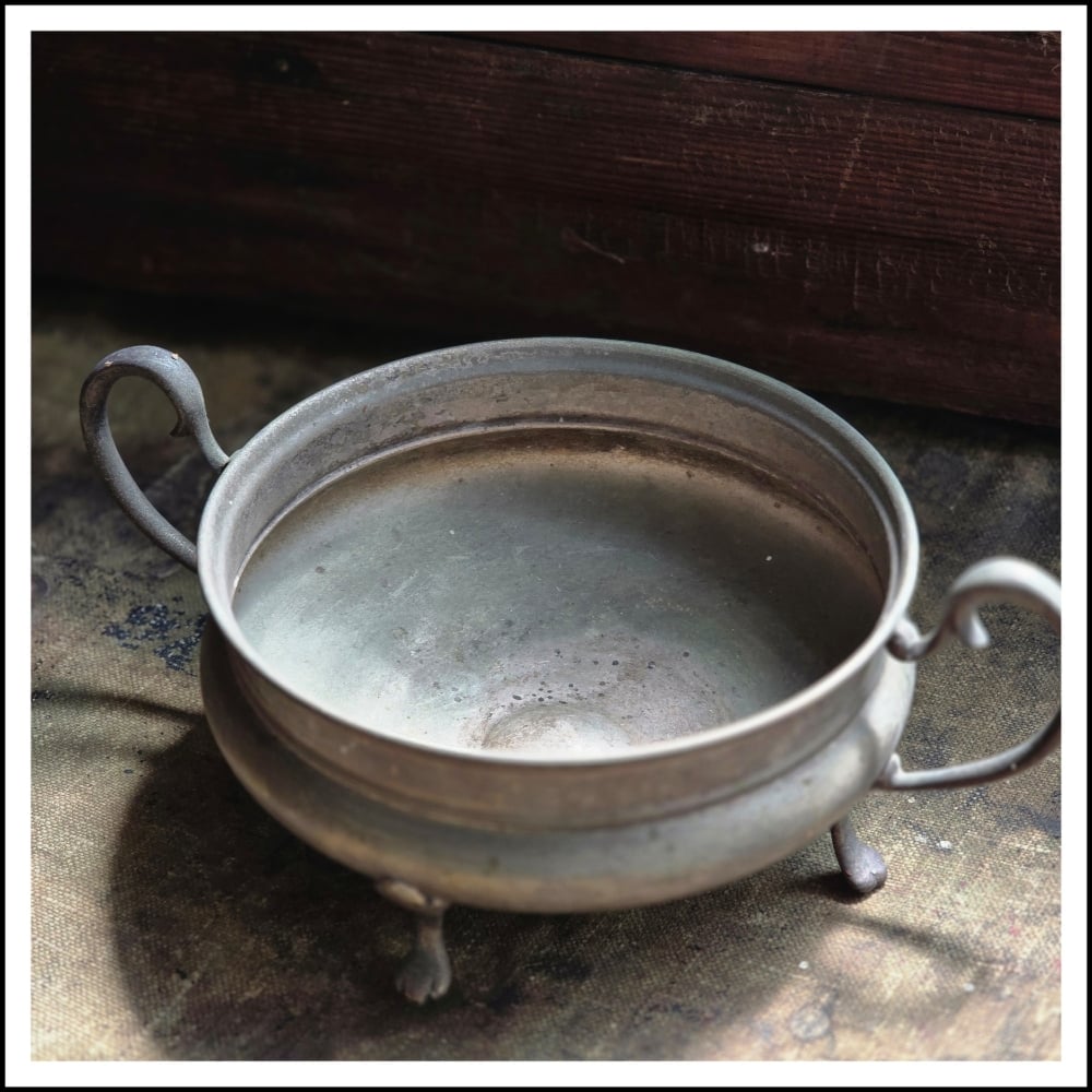 Beautifully aged + tarnished silver handled fruit display bowl with three dainty feet
