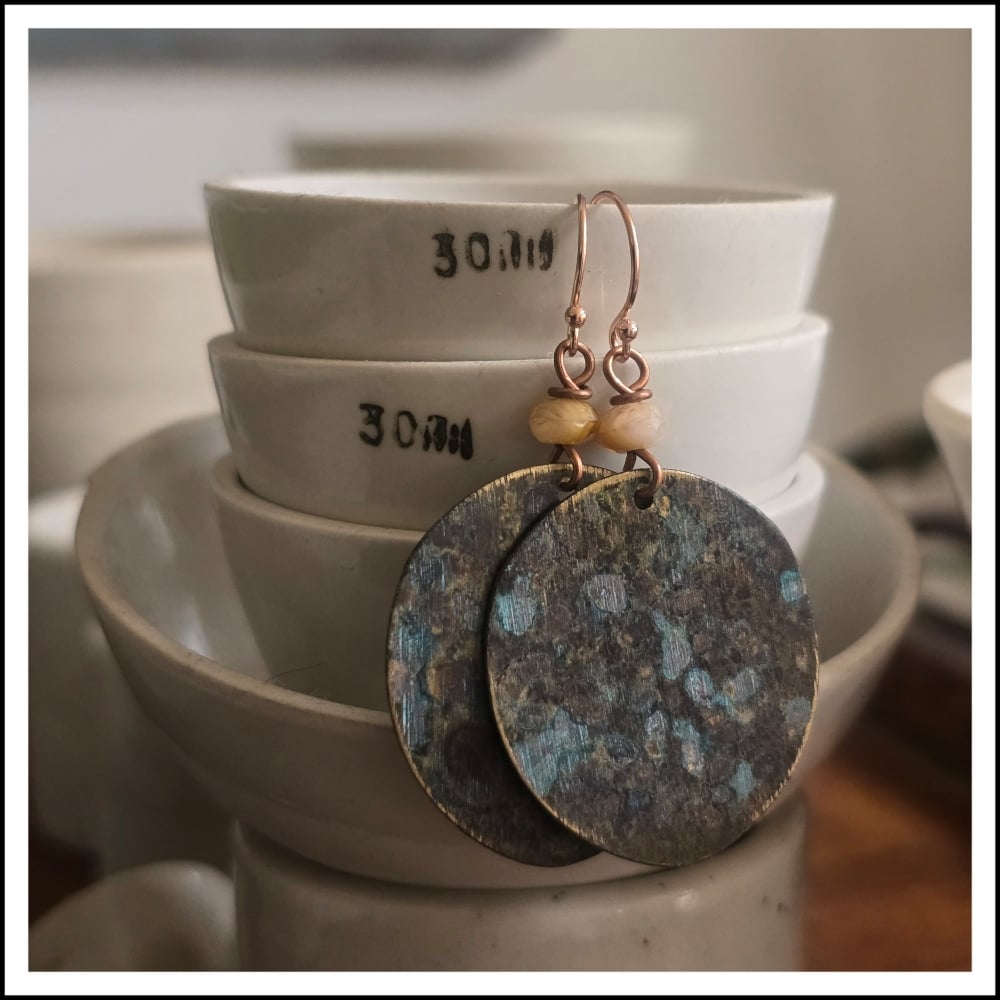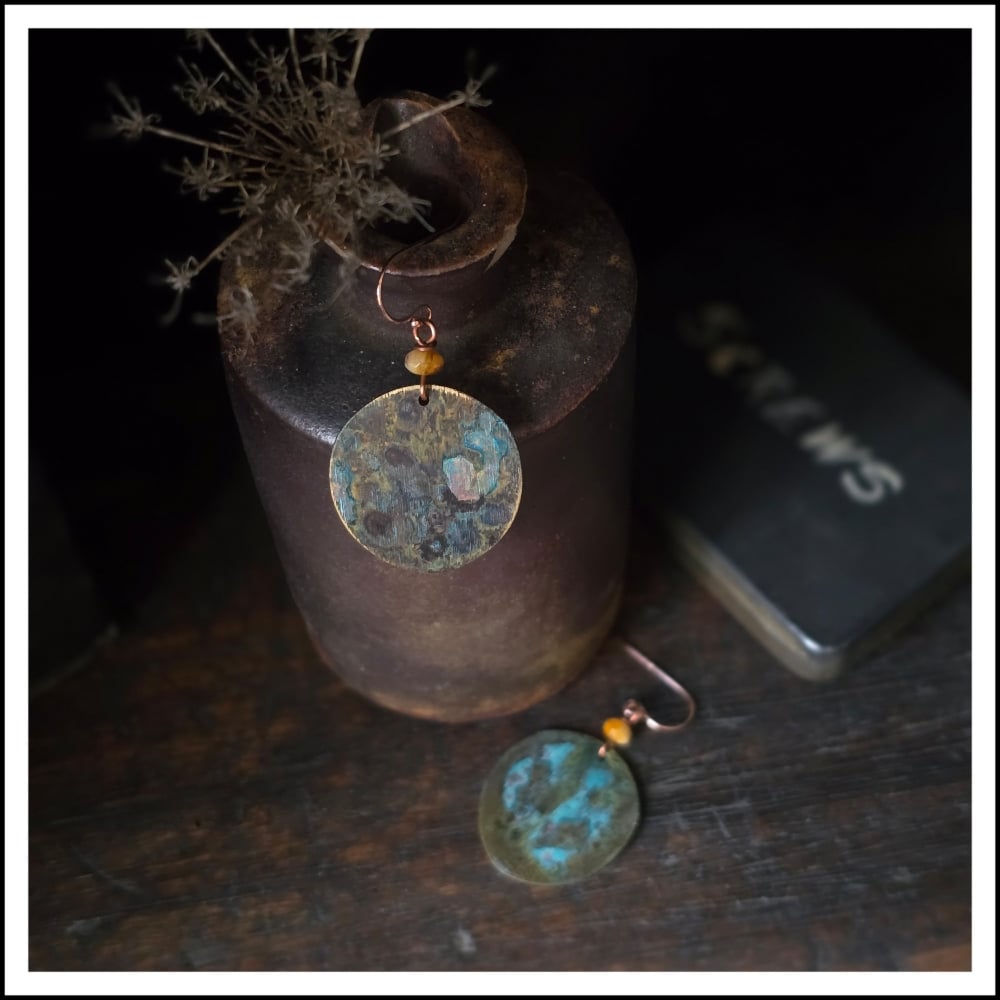 Aged patina raw brass disks with flecks of eye catching verdigris, paired with peach Czech glass beads. Finished on rose gold earwires