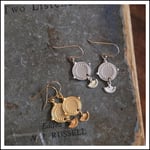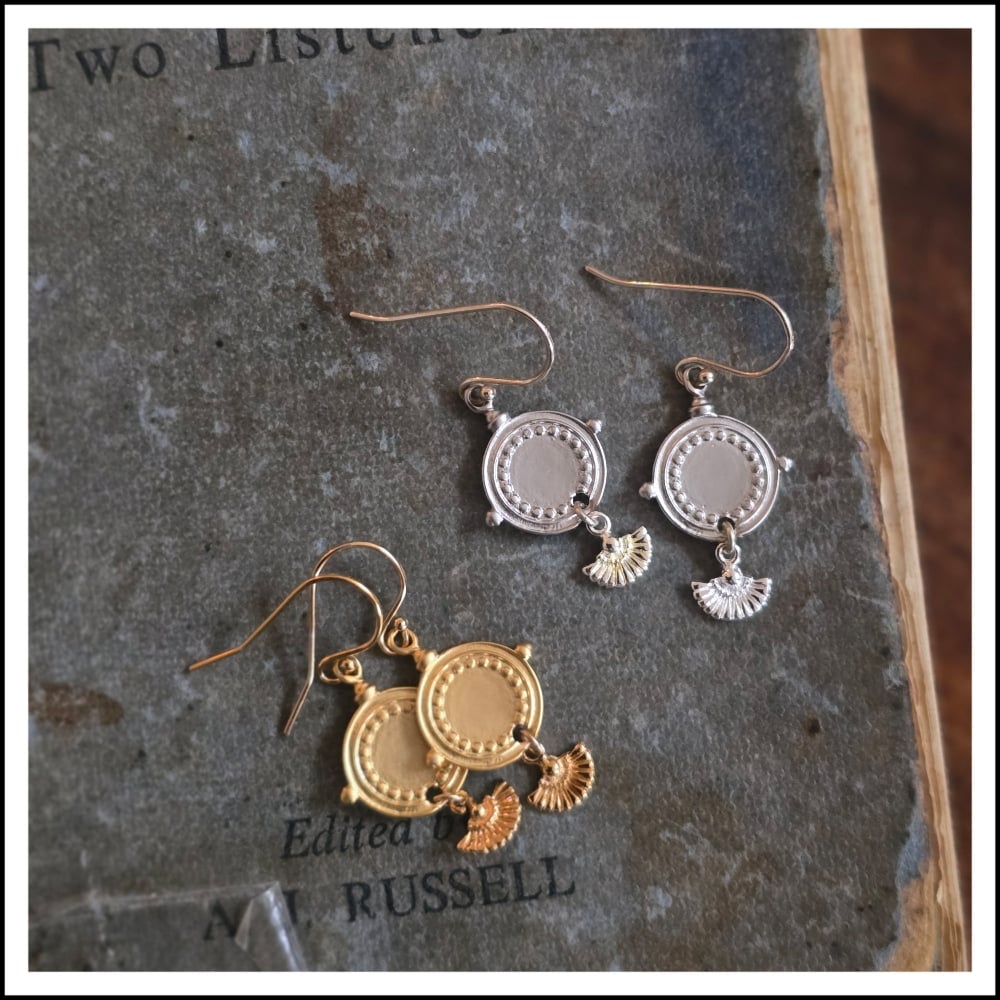 Available in both rhodium silver and gold plated these mirror disks are adorned with a matching sterling silver or 14k gold fan "dangle". Finished on complimentary sterling silver or gold filled earwires