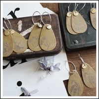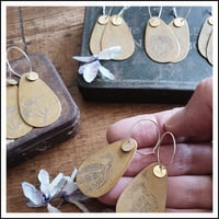 Gold patinaed metal tear pendants embellished with etched detail of original native Australian flora sketches.
