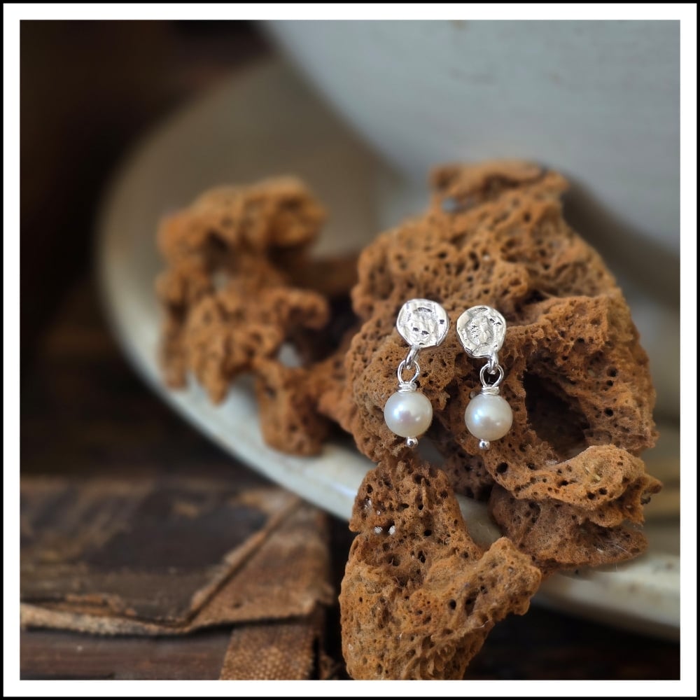 Pebble textured earring studs available in gold or rhodium silver plate options, adorned with beautiful luminous freshwater pearls. Inspired by our deep love + connection to the calming sheltered bays dotted around our stunning Mornington PeninsulaEarring nuts hypoallergenic stainless steel
